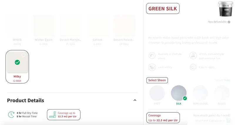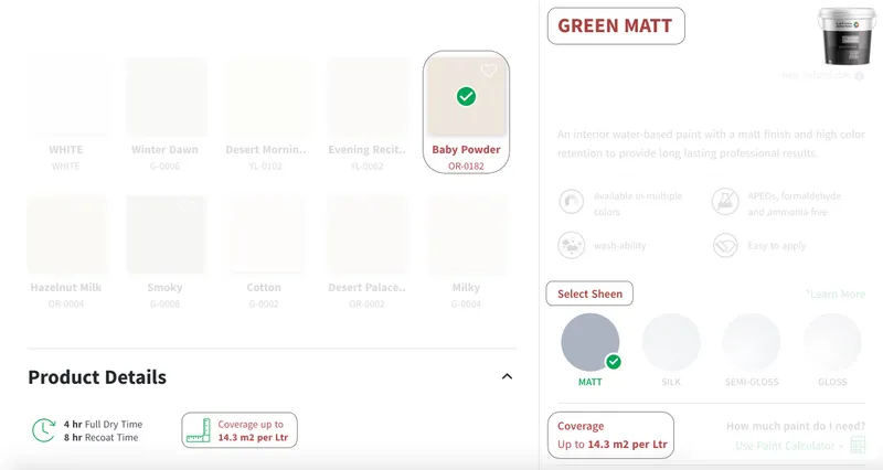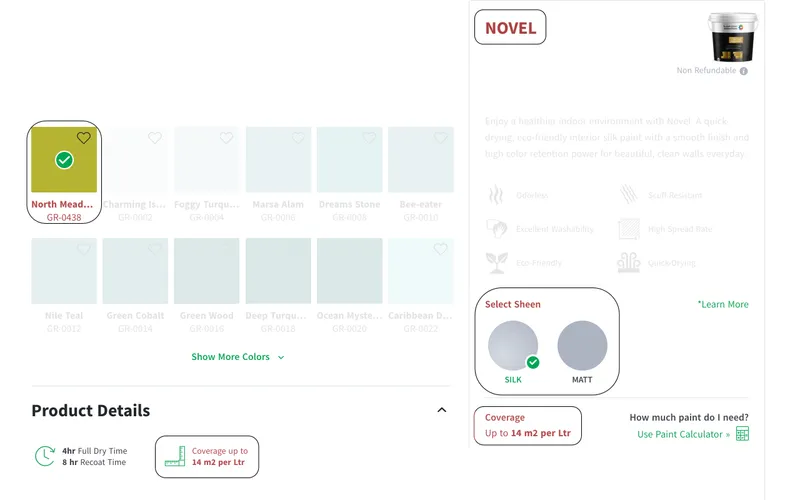 بعد الانتهاء من العمليات الحسابية السابقة، ابحث عن معدل انتشار الدهان لمعرفة عدد الليترات المطلوبة، باستطاعتك ايجاده بعد اختيارك للمنتج كما في المثال التالي