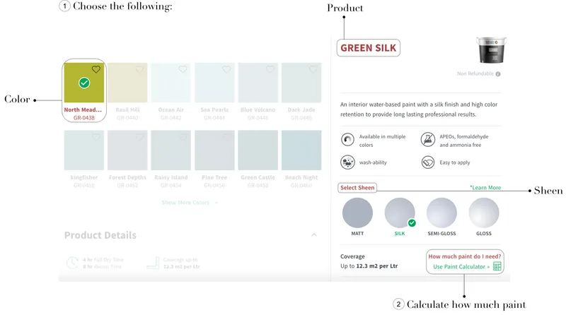 لاستخدام الحاسبة توجه الى قائمة المنتجات، اختر المنتج، اللون المطلوب واللمعة للبدء بالعملية الحسابية كالتالي: